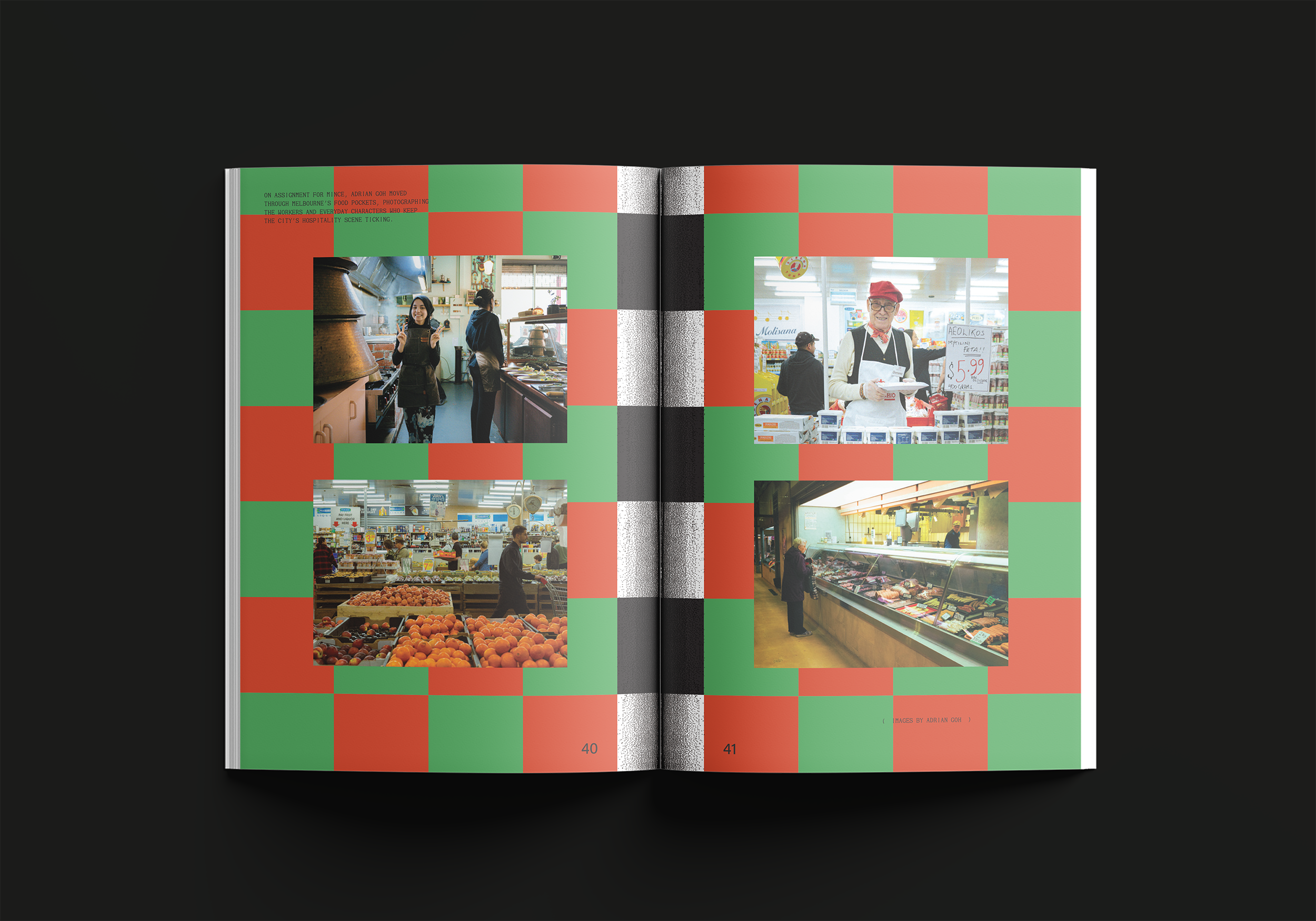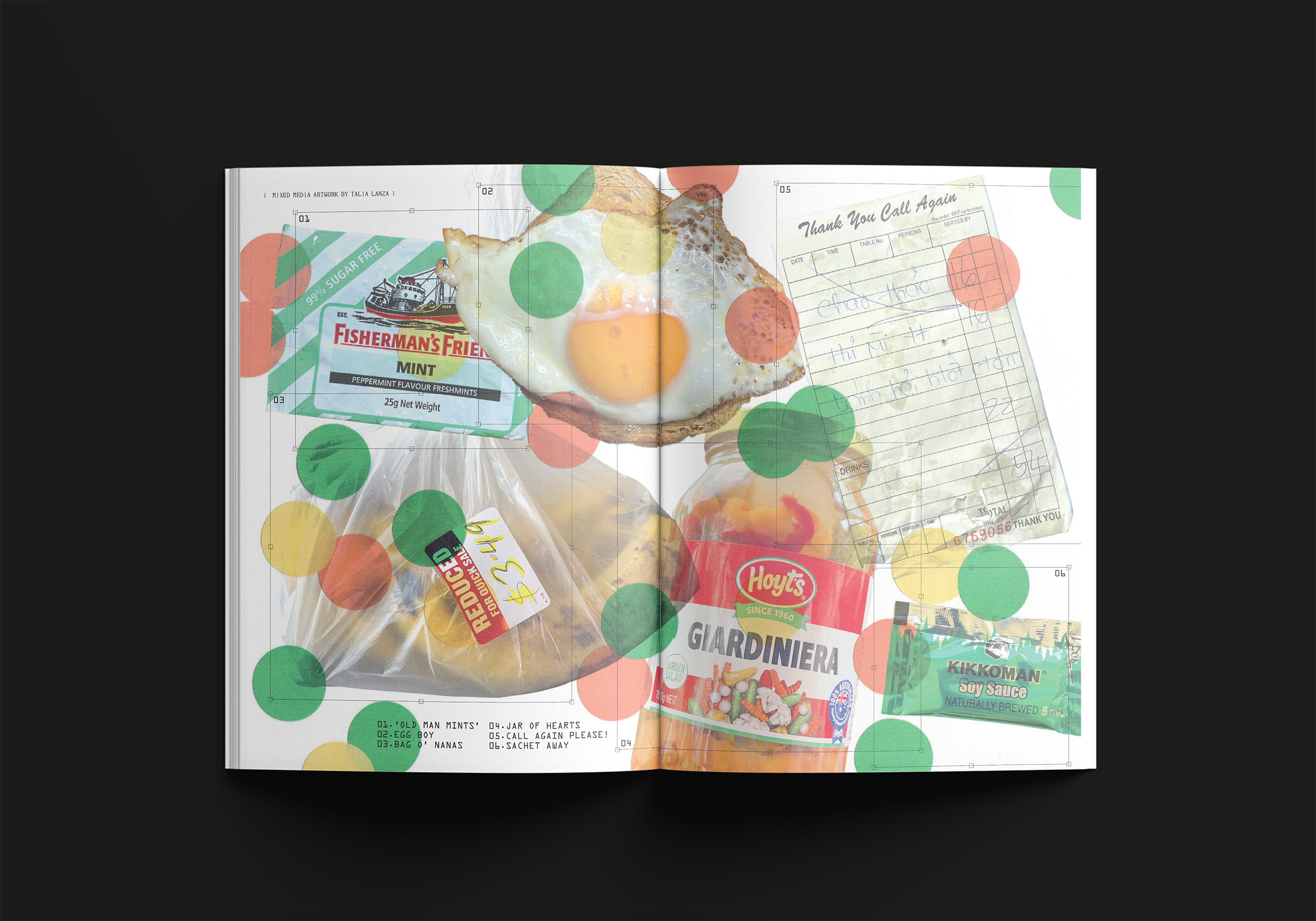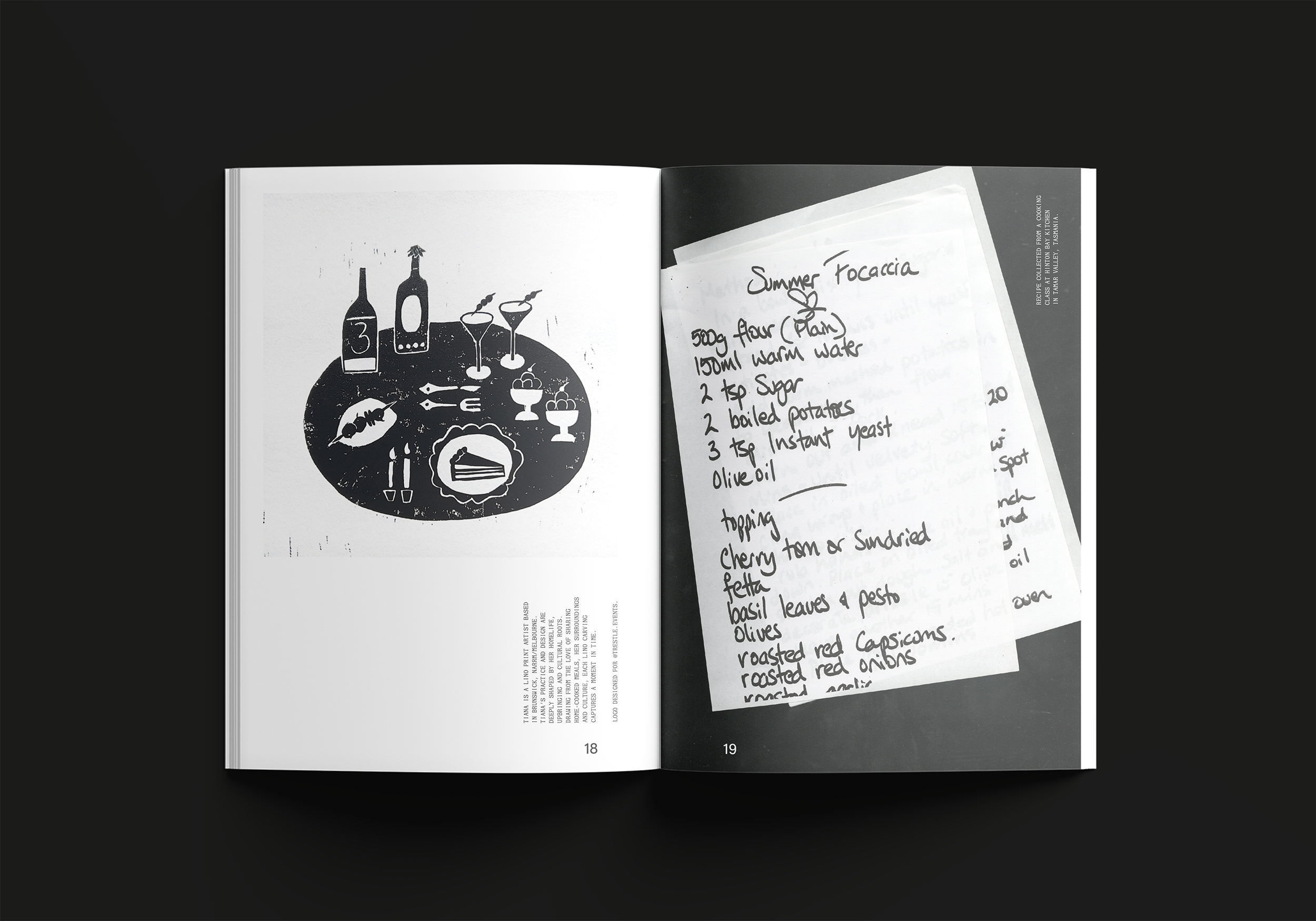 The front cover was designed to spark curiosity and invite closer inspection, whilst helping readers to decipher the logo which readers, most likely, are seeing for the first time. What initially reads as a slab of mince meat is, on closer look, actually a packet of noodles. The image was photographed to feel like a scanned artefact, setting the tone for the internal pages where a colleciton of artefacts from local hospitality venues are depicted.
